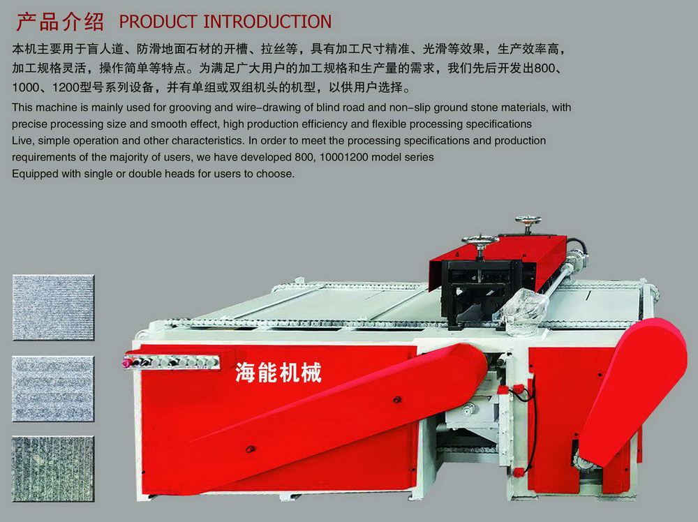 本機主要用于盲人道、防滑地面石材的開槽、拉絲等,具有加工尺寸精準、光滑等效果,生產(chǎn)效率高,